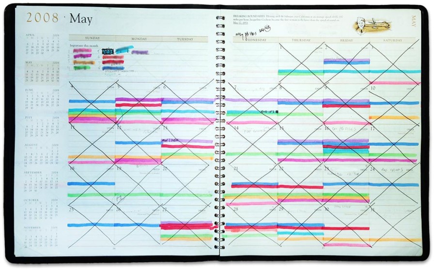 I got a little fancy with different colors, but the idea was the same: try to work on each project a little every day. Eventually I felt that I was spending too much time on the chain rather than the tasks at hand, so I stopped using this method and have moved on to use other things like coach.me (formerly Lift app) to keep track of daily goals.